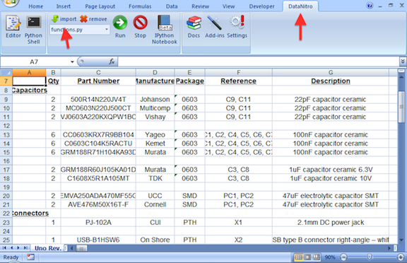 Finally, open the BOM you're working on, select the DataNitro tab, and click on "Import" to import the Python Octopart functions file you downloaded.