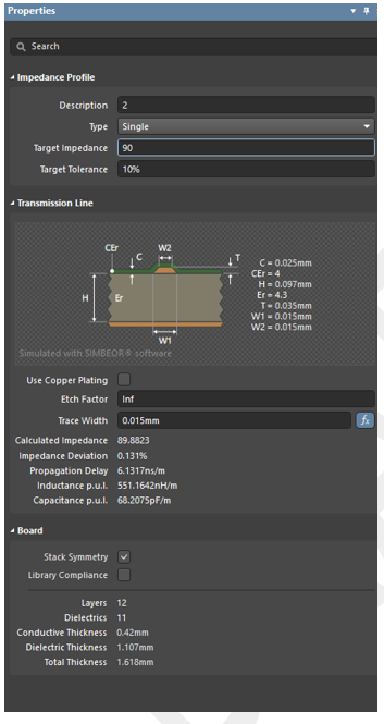 Jeśli warstwa nie może mieć impedancji 90 omów, program Altium powiadomi nas o tym, dodając ostrzeżenie do profilu impedancji.